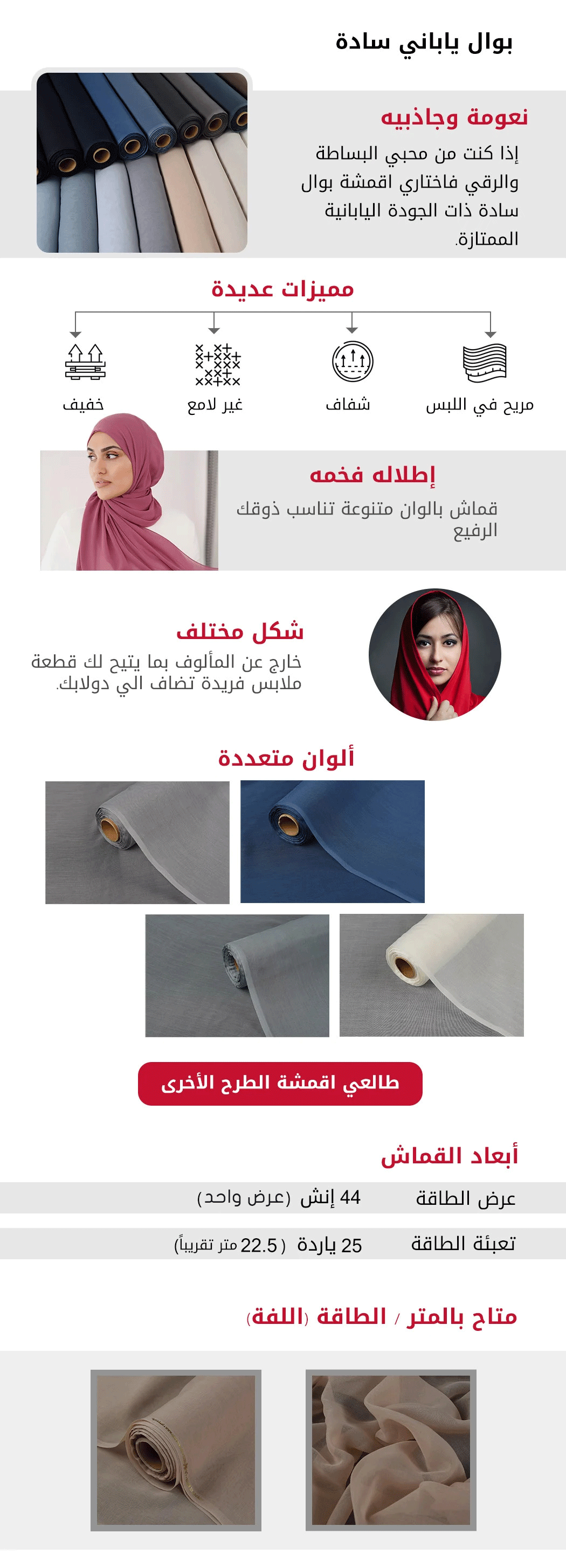 إذا كنت من محبي البساطة والرقي فاختاري اقمشة بوال سادة ذات الجودة اليابانية بدون تردد أو تفكير حيث ترتدين الشال الأنيق المنسدل في رقة على كتفيك لتتحركي في خفة ورشاقة مع احتفاظه بشكله ورونقه.
