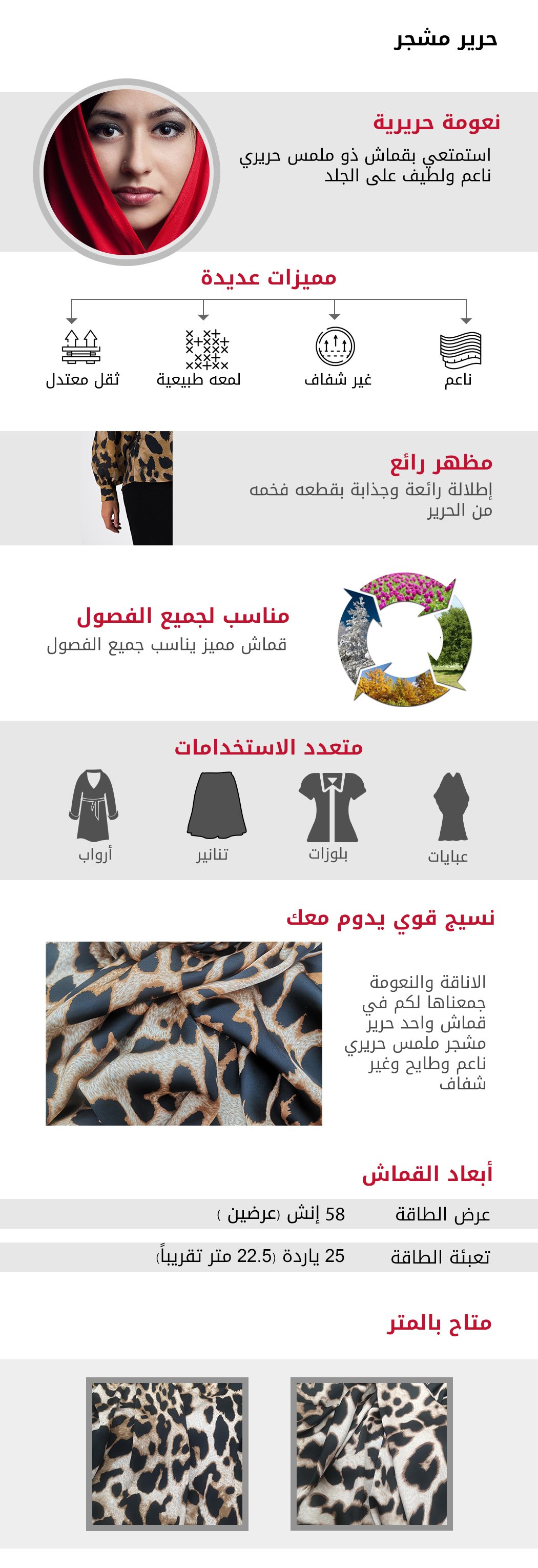 الاناقة والنعومة جمعناها لكم في قماش واحد (حرير مشجر ) ملمس حريري ناعم وطايح وغير شفاف.