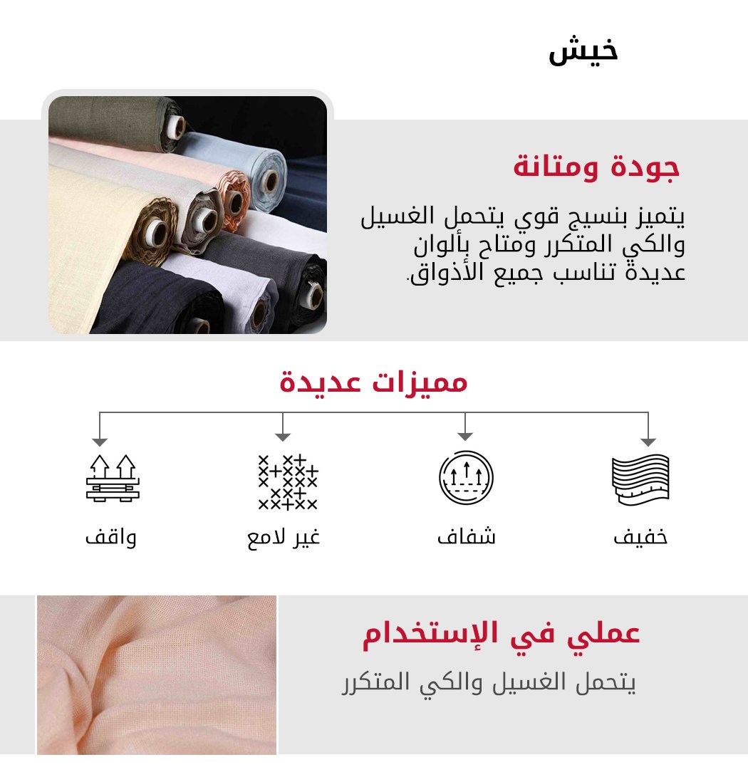 يتميز بنسيج قوي يتحمل الغسيل والكي المتكرر ومتاح بألوان عديدة تناسب جميع الأذواق.