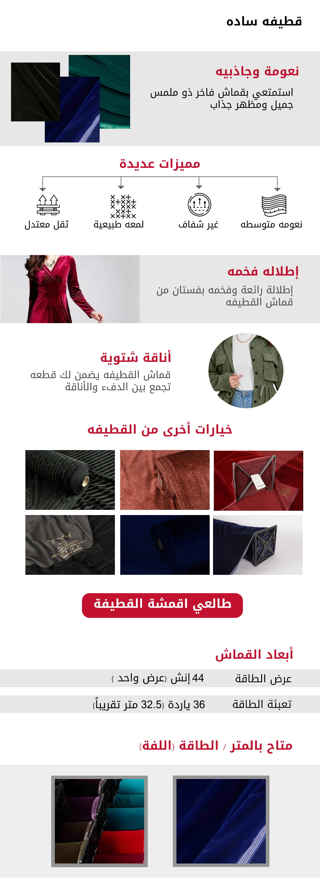 عند التحدث عن المناسبات المميزة فلا غنى عن أقمشة القطيفة الساده ذات اللمسة الانثوية الناعمة والتي تضم تشكيلة متنوعة من الألوان الجذابة التي يمكنك استخدامها لتفصيل أروع فساتين المناسبات - الطاقة تحتوي على 36 ياردة.