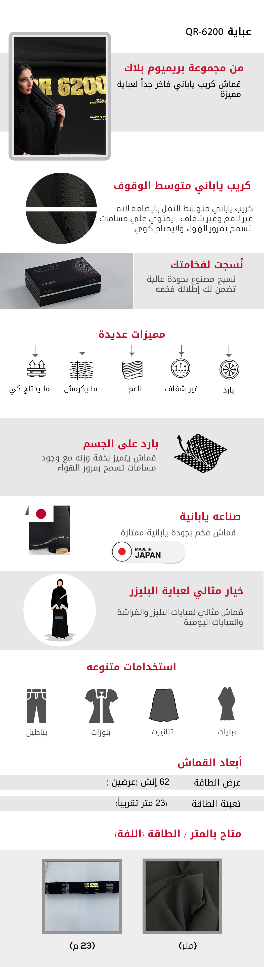 لتصميم عباية عملية و تناسب مختلف الأوقات استخدمي (قماش QR6200) من مجموعة بريميوم بلاك اليابانية العالية والمميزة بالمتانة وكذلك محافظتها علي جمال الشكل لقدرتها الكبيرة علي مقاومة التجعد.