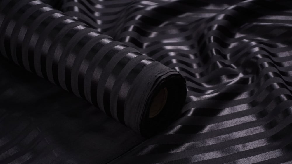 اختاري اللون الأسود الملكي الذي يتميز بفخامته وإطلالته الراقية مع الخطوط الطولية اللامعة التي تميز سطح القماش فتزيد من جمالك مع نعومته وقدرته على امتصاص الرطوبة. * (تركيبة القماش : 100٪ بوليستر)